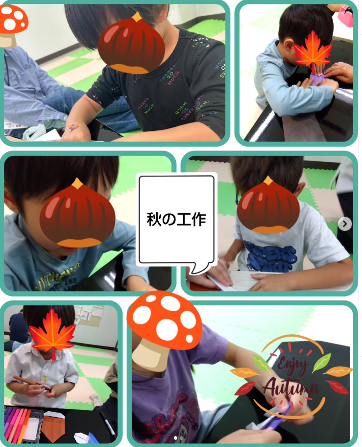 折り紙できのことどんぐりを折り、シールできのこの柄とお顔を描いてもらいました✨