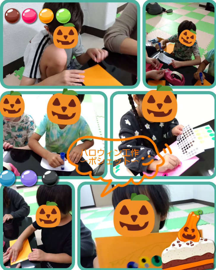 ハロウィンに向けてお菓子を入れるポシェットの工作をしました✨色画用紙にお化けの目をシールでつけてもらい口はペンで描いたりと自分だけのポシェットを作りました🎶