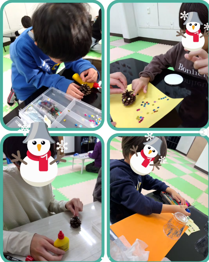 以前こっそり職員が拾いに行った松ぼっくりを使って、スノードームづくりをしました❄